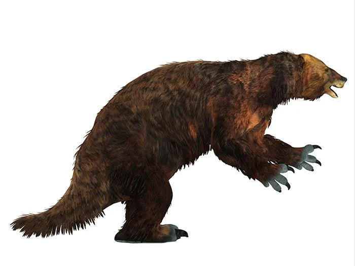 Megatherium is the largest sloth yet discovered at 20-feet long and over 4 tons. This elephant-sized sloth was a gentle giant with long hair. It ate plants by rearing up its strong hind legs and then using its arms to tug at trees and bring leaves to its mouth. Megatherium had massive limbs with long, curved claws used for grasping branches and defending itself against saber-toothed cats and other ice age predators. Its powerful jaws had simple peg-like teeth for chewing plants. The structure of its foot bones required these sloths to walk slowly on the edges of its feet while keeping its claws curled inward off the ground.